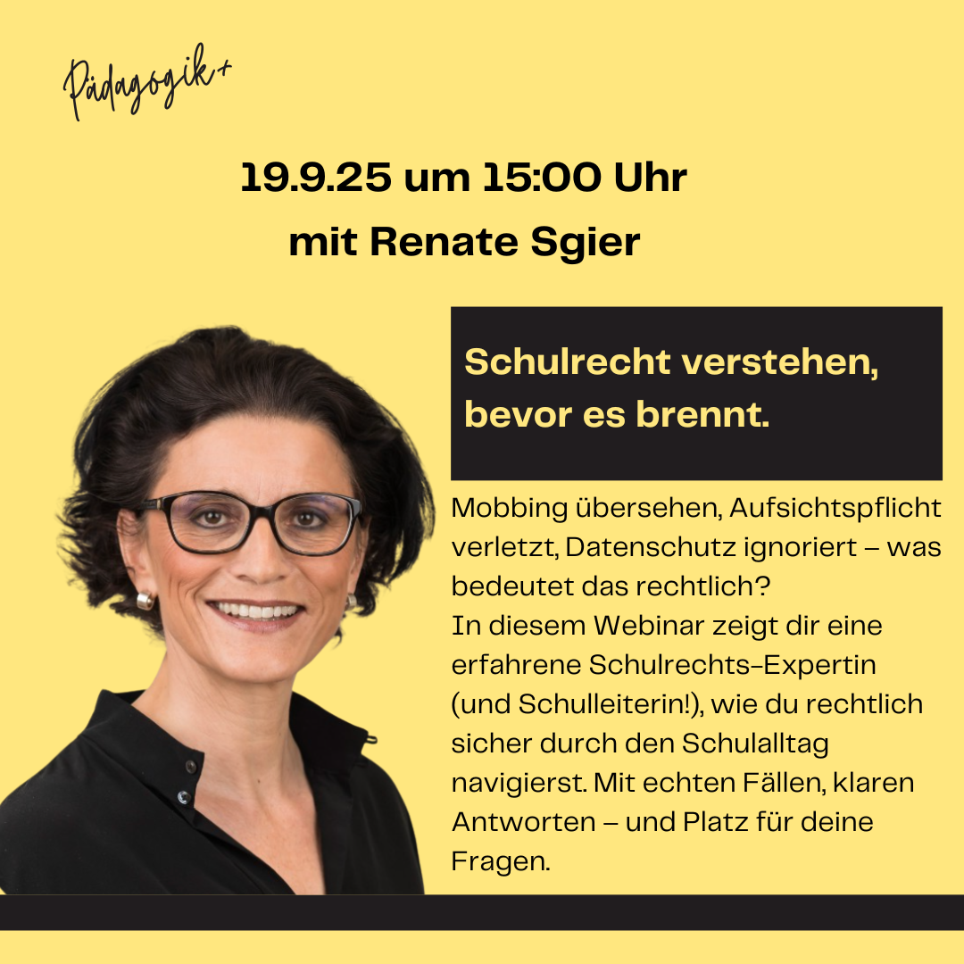 Mobbing übersehen, Aufsichtspflicht verletzt, Datenschutz ignoriert – was bedeutet das rechtlich? In diesem kostenfreien Webinar zeigt dir eine erfahrene Schulrechts-Expertin (und Schulleiterin!), wie du rechtlich sicher durch den Schulalltag navigierst. Mit echten Fällen, klaren Antworten – und Platz für deine Fragen.